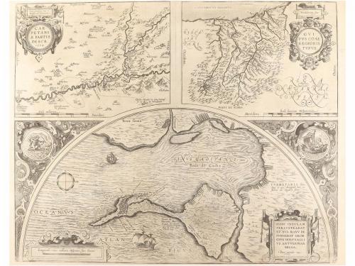 1584. MAPA. HOEFNAGLIUS, GEORGIUS:. CARPETANIAE PARTIS DESCR. GUIPUSCOAE REGIONGI TYOUS. HANC INSULAM PERLUSTRABAT, ET SUA MANU DE PINGEBAT GEORGIUS HOEFNAGLIUS ANTUERPIAN BELGA. Mapa calcográfico sobre papel verjurado. Papel: 42 x 52,5 cm; huella: 39,5 x 48,5 cm. Texto francés en el reverso con capitales xilografiadas. Ligeramente corto de margen superior; señal de doblez central.