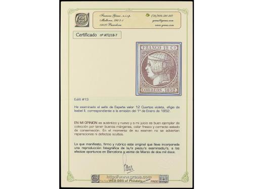 (*) ESPAÑA. Ed. 13. 12 cuartos lila. PIEZA DE LUJO. Cert. GR (*) ESPAÑA. Ed. 13. 12 cuartos lila. PIEZA DE LUJO. Cert. GR