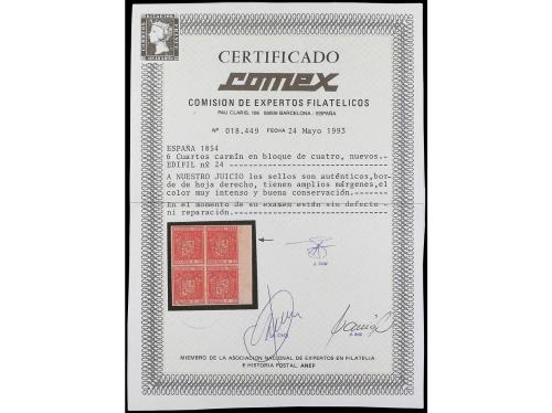 ** ESPAÑA. Ed. 24. 6 cuartos carmín. Extraordinario ejemplar borde de hoja, color muy fresco conservando toda su goma original intacta. ESPECTACULAR y de LUJO. Cert. COMEX (fotocopia) del bloque de cuatro de donde procede.