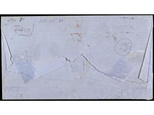 ESPAÑA. 1859. BILBAO a AREQUIPA (Perú). 2 reales violeta dos parejas. Mat. R.C. 20 de Bilbao. Doble porte por el correo británico vía Londres y Panamá. Preciosa y RARA.