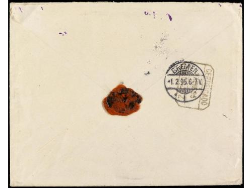 ESPAÑA. Ed. 219, 224/26. 1895. Sobre CERTIFICADO de BADAJOZ a ALEMANIA. 15 c., 50 c, 75 c. y 1 pta. mat. fechador. PRECIOSO y RARO.