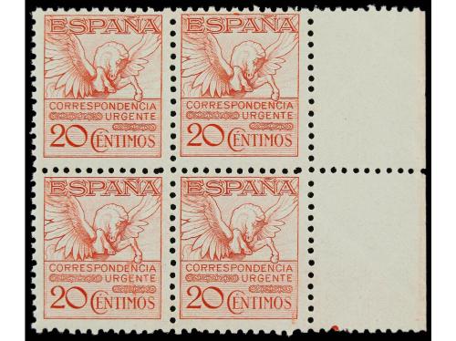 ** ESPAÑA. Ed. 592A. 20 céntimos rosa. Bloque de cuatro. Dos sellos, goma parcial de origen. Cat. 520€.