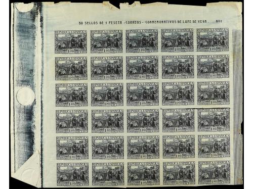 ** ESPAÑA. Ed. 693s. 1 pta. pizarra SIN DENTAR. Bloque de 30, cabecera de hoja. Algún sello con sombras del tiempo y pliegues habituales propios de los grandes bloques. Cat. 4.650€.