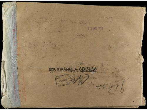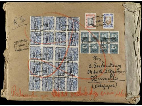 ESPAÑA. Ed. 769. 1938. BARCELONA a BRUSELAS. Sobre de gran tamaño franqueado con sellos de 10 cts. (8) y un bloque de 20 sellos de 2 pts. azul. Pagando la tarifa de 40,80 pts. para un paquete de 2 kgr. enviado por correo certificado. Espectacular y MUY RARO franqueo, probablemente el más alto conocido con este sello.