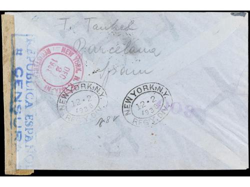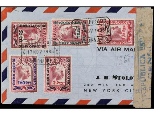 ESPAÑA. Ed. 782/86. 1938. BARCELONA a NEW YORK. Serie completa en carta circulada, mat. especial de la A.F.O. de Barcelona. Etiqueta de censura y llegada al dorso.