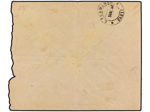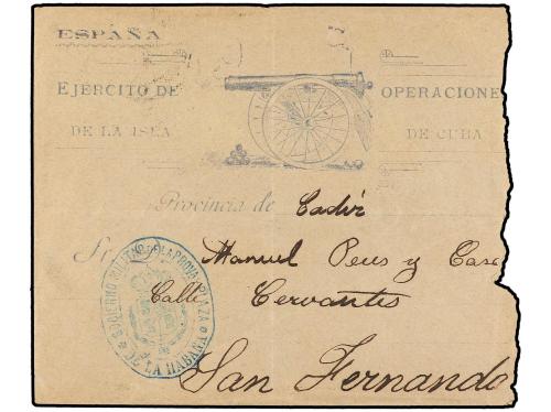CUBA. 1893. LA HABANA a ESPAÑA. Sobre con membrete EJÉRCITO DE OPERACIONES DE LA ISLA DE CUBA circulado con la Franquicia GOBIERNO MILITAR DE LA PROVA. Y PLAZA DE LA HABANA. Rotura a la derecha por apertura descuidada. MUY RARO.