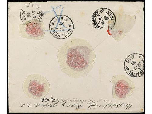 FILIPINAS. Ed. 57(3) y 59(4). 1887. Sobre certificado de MANILA a ALEMANIA (varias redirecciones). 2c. (3) y 2 4/8 (4). Mat. fechador y marca paquebot francés COL. ESPG/P.FR.LIGNE N (Salles 1937). Al dorso tránsitos, llegada y lacres. RARA.