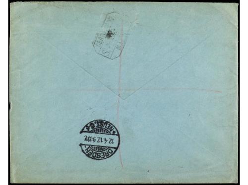 COLONIAS ESPAÑOLAS: GUINEA. Ed. 59, 60, 62/71. 1912. Certificado de BATA a DRESDEN (Alemania), circulada con la serie de 1909 excepto el sello de 5 c., mat. CORREOS / BATA. Al dorso llegada. MUY RARA.