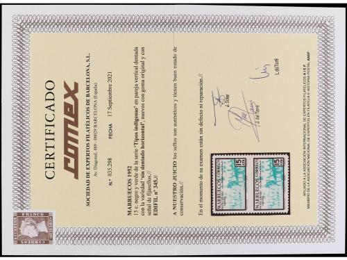 * MARRUECOS. Ed. 345. 15 cts. verde y negro. Pareja vertical SIN DENTAR EN MEDIO. RARÍSIMA, solo 10 conocidos. Cert. COMEX.
