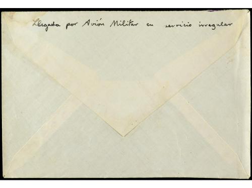 COLONIAS ESPAÑOLAS: SAHARA. Ed. 41. 1935 (10 septiembre). RIO DE ORO a CABO JUBY. Sobre con membrete de AVIACIÓN MILITAR RIO DE ORO circulada con sello de 30 cts. castaño. Al dorso manuscrito "Llegada en avión militar en servicio irregular" . RARA.