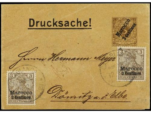 MARRUECOS ALEMAN. 1902. CASABLANCA a ALEMANIA. Faja de prensa de 3 cts. sepia con franqueo adicional de dos sellos de 3 cents. s. 3 pf.