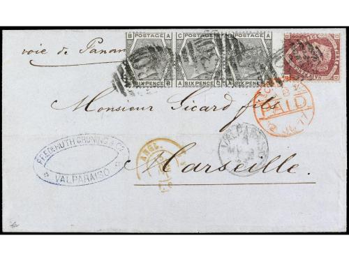 CHILE. 1877. VALPARAISO a FRANCIA. Envuelta circulada con sellos británicos de 1 1/2 d. carmín y tira de tres del 6 p. castaño negro, pl. 15, mat. C 30 ovalado de la B.P.O. de Valparaiso. Muy rara combinación de franqueo.
