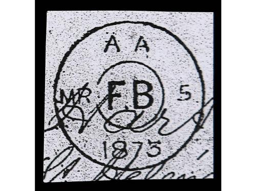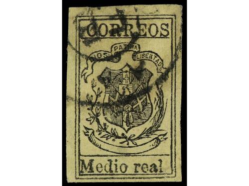 ° REPUBLICA DOMINICANA. Sc. 29. 1870-73. 1/2 real negro s. amarillo. Mat. AA/FB (London Foreign Branch). RARÍSIMO, probablemente único.