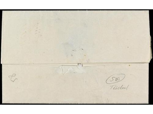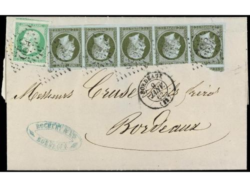 FRANCIA. 1862. BORDEAUX correo interior. 1 cto. verde tira de cinco y 5 cts. verde amarillo. Rara combinación de franqueo.