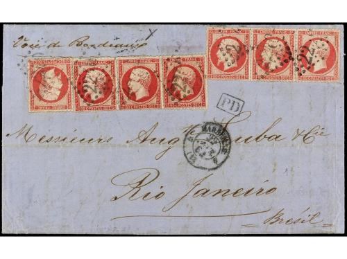 FRANCIA. Yv. 24 (7). 1864. MARSEILLE a RIO DE JANEIRO. 80 cts. rosa (7). Raro franqueo.