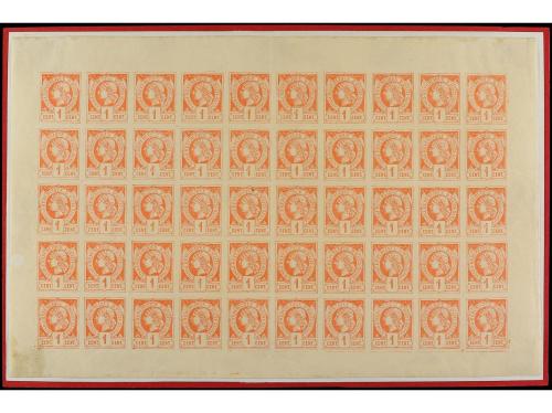 **/* HAITI. Yv. 1. 1881. 1 cto. rojo. Hoja entera de 50 sellos, pequeña mancha en el margen inferior izquierdo y alguna doblez entre los sellos sin importancia. Muy rara no más de cuatro hojas completas conocidas.