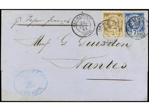 HAITI. Yv. 3, 5. 1881. CAP HAITIEN a FRANCIA. 3 cents. bistre y 7 cts. azul. PRECIOSA.