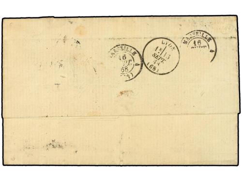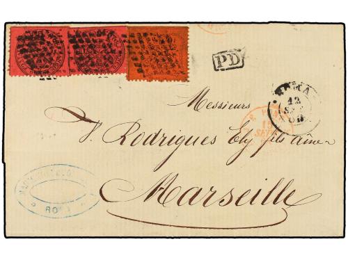 ITALIA ANTIGUOS ESTADOS: ESTADOS PONTIFICIOS. Sa. 26, 27 (2). 1868. ROMA a FRANCIA. 10 cts. naranja y 20 cts. rojo castaño (2). Muy bonita y poco usual combinación de franqueo.