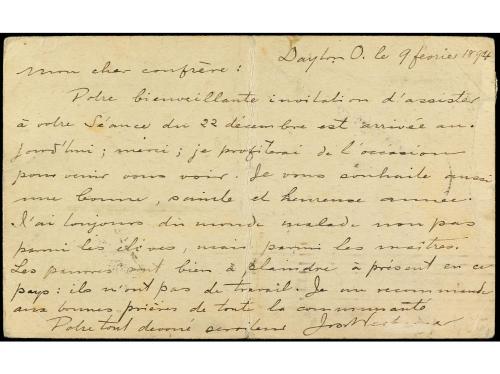 JAPON. 1894. DAYTON (USA) a TOKIO. Entero Postal de 1 cent. negro con franqueo adicional de 1 ctvos. azul, tasada a la llegada con sellos japoneses de 2 sen. rosa y 4 sen. bistre (defecto). Rara combinación de franqueo.
