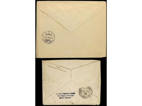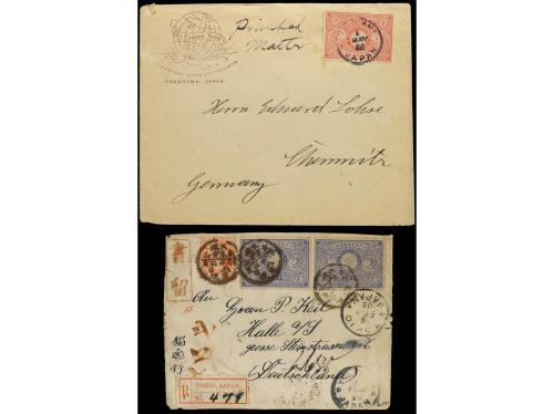 JAPON. 1895. Dos cartas circuladas por correo certificado con franqueo de 5 sen. azul (2) y 20 sen. naranja y la otra circulada con la tarifa de impresos de 2 sen. rojo.