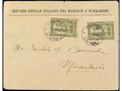 MARRUECOS: CORREO LOCAL. Yv. 55, 61. 1898. MAZAGÁN a MARRAKECH. Sobre con encabezamiento SERVIZIO POSTALE ITALIANO FRA MAZAGÁN E MARRAKESH con sellos de 25 cts. oliva y 20 cents. s. 25 cts. oliva. RARA.