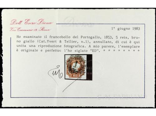 ° PORTUGAL. Mu. 1. 5 reis castaño, mat. círculo de barras con cifra "1" de Lisboa. Grandes márgenes. Cert. E. DIENA. Cat. 1.600€.