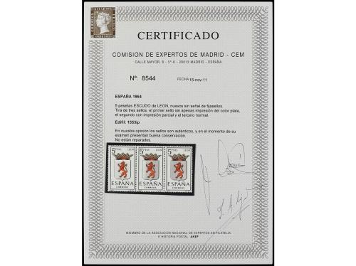 ** ESPAÑA. Ed. 1553. ESCUDO DE LEÓN. 3 pts. multicolor. Tira de tres, falta la impresión del color plateado en un sello y parcialmente en otro. MUY RARA. Cert. CEM.