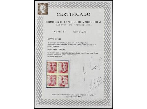 ** ESPAÑA. Ed. 1048s. 25 cts. castaño lila. Bloque de cuatro SIN DENTAR, sellos superiores fuelles de papel y el segundo sello con una interesante variedad con el cartucho inclinado. No reseñado. Cert. CEM.