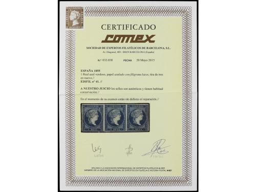 ** ESPAÑA. Ed. 41. 1 real azul verdoso. Tira de tres color muy fresco y plena goma original sin fijasellos. ESPECTACULAR y de LUJO. Cert. COMEX. Cat. 6.075€.