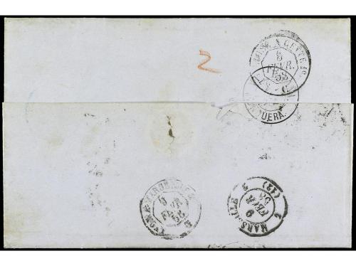 ESPAÑA. Ed. 48. 1858. BARCELONA a FRANCIA. Circulada con sello de 4 cuartos rojo antes del Convenio Postal, tasada con 5 décimas.