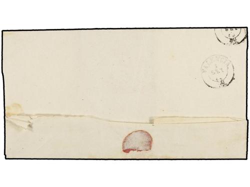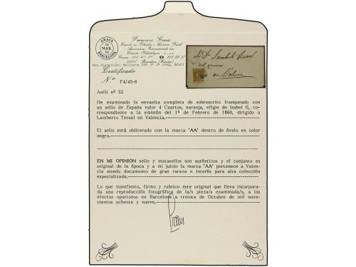 ESPAÑA. Ed. 52. 1860. Envuelta dirigida a VALENCIA. 4 cuartos amarillo, mat. A.A. dentro de un óvalo estampado a la llegada a Valencia. Sello con márgenes cortos pero muy rara. Cert. GRAUS.