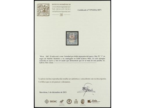 ° ESPAÑA. Ed. 95. 25 mils. azul y rosa. DOBLE IMPRESIÓN DEL MARCO. No reseñado en Edifil pero sí en Galvez nº 94D.
