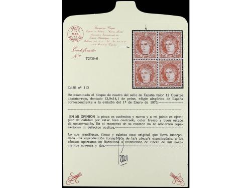 * ESPAÑA. Ed. 113. 12 cuartos castaño rojo. Centraje perfecto. Cert. GRAUS del bloque de donde procede. Cat. 408€.
