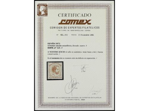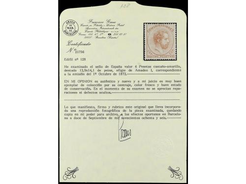 * ESPAÑA. Ed. 128. 4 pesetas castaño. Muy bien centrado. Cert. GRAUS y COMEX.