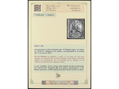 * ESPAÑA. Ed. 152. 10 pesetas negro. Buen centrado. Muy buen ejemplar. Cert. GRAUS.