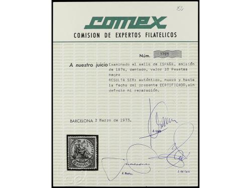 * ESPAÑA. Ed. 152. 10 pesetas negro. Buen ejemplar. Dentado derecho algo irregular. Cert. COMEX (1973) . Cat. 2.800€.
