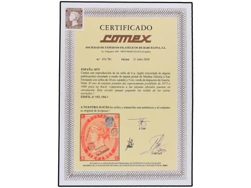 ESPAÑA. Ed. 153, 154. 1875. MEDINA SIDONIA a SAN FERNANDO. Cartón con reproducción de un sello inglés de 6 p. rojo (recortada de alguna publicación) circulada a modo de tarjeta Postal. Escrita por el Dr. Thebussem y dirigida a su hermano. Franqueada con sellos de 10 cts. castaño y 5 cts. verde de Impuesto de Guerra, mat. fechador de Medina Sidonia. ESPECTACULAR y DE GRAN RAREZA, especialmente por circular durante la época prohibida. Cert. COMEX. Nota: El uso de tarjetas postales fue expresamente prohibido de 1873 a 1886 para no hacer la competencia a las tarjetas oficiales puestas en circulación. Ésta circuló aunque pagando la tarifa de las cartas normales.