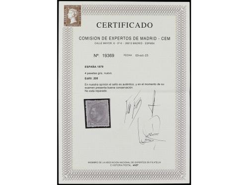 * ESPAÑA. Ed. 208. 4 pts. gris. Centrado de lujo. RARO en esta calidad. Cert. CEM. Cat. 1.200€.