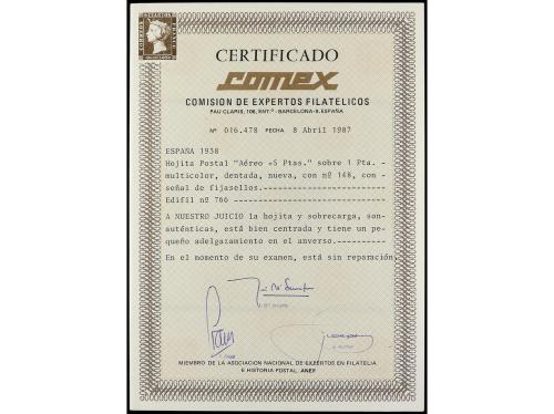 * ESPAÑA. Ed. 766. HB Aéreo + 5 pts. Nº 148, Edifil especializado 766a, 1ª tirada. Ínfimo adelgazamiento en anverso. Cert. COMEX. Cat. 1.200€.