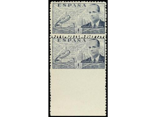 ** ESPAÑA. Ed. 944, 946ddh y smz. 1 pta. azul y 4 pts. azul oscuro en pareja vertical, un sello DOBLE DENTADO HORIZONTAL y el otro SIN DENTAR MARGEN INFERIOR. Rara variedad combinada no reseñada.