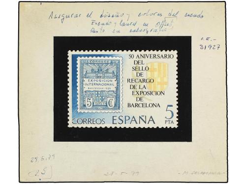ESPAÑA. Ed. 2549. 50 ANIV. DEL SELLO DE RECARGO. Dibujo original realizado sobre cartulina (15,5 x 13,3 cm.) en tinta china y acuarela. Firma del grabador M. SALAMANCA y diversas anotaciones y firmas de control. Pieza excepcional, UNICA EXISTENTE.