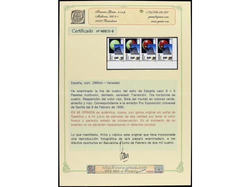 ** ESPAÑA. Ed. 2990 (4). EXPO'92. 8+5 pts. multicolor. Tira de 4 con IMPRESIÓN DESPLAZADA, un sello SIN EL COLOR ROJO y un sello con la IMPRESIÓN PARCIAL. RARO. Cert. GRAUS.