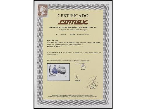 ** ESPAÑA. Ed. 3591s. 150 AÑOS DEL FERROCARRIL EN ESPAÑA. 35 pts. ultramar y negro SIN DENTAR. RARÍSIMO. Cert. COMEX.