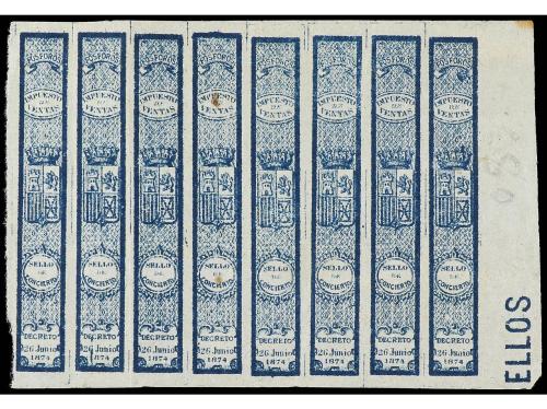 * ESPAÑA: FISCALES. FÓSFOROS. IMPUESTO DE GUERRA, 1874. Sellos de Concierto tamaño 57x10 mm. Tira de siete y ocho en color azul y verde (no catalogado). Al. 4 .