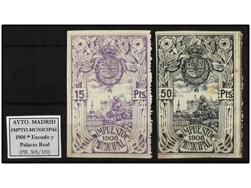 ESPAÑA: FISCALES. 1908. AYUNTAMIENTO DE MADRID. IMPUESTO MUNICIPAL. 1908 15 pts. violeta y 50 pts. negro. MUY RAROS.