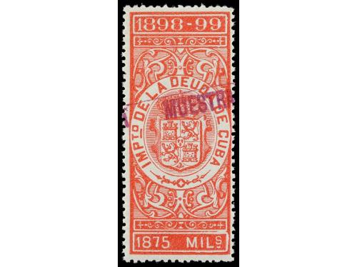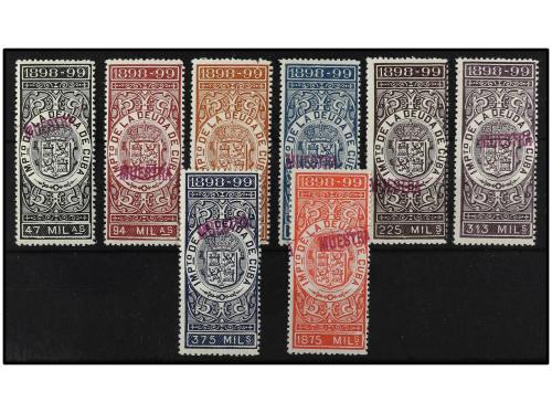 CUBA. 1898-99. FISCALES. IMPUESTO DE LA DEUDA. Conjunto de 8 valores. Habilitados MUESTRA EN VIOLETA. RARO.