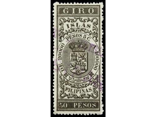 ** FILIPINAS. 1894. FISCALES. GIRO. Serie completa habilitada MUESTRAS en violeta. MUY RAROS. El sello de 50 pesos no está catalogado ni en Forbin ni Barata. Forbin 57/65 .