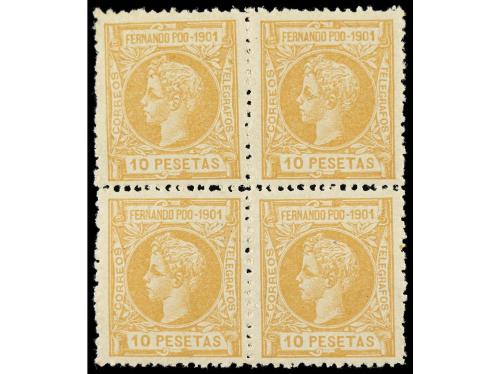 ** COLONIAS ESPAÑOLAS: FERNANDO POO. Ed. 95/109 (4). 4 SERIES COMPLETAS, 15 valores en bloques de cuatro. RARA sin fijasellos. Cat. 2.600€.
