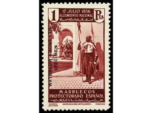 (*) MARRUECOS. Ed. 171Ma, 176Ma, 180Ma, 185Ma. CAMBIOS DE COLOR. 5 cts. castaño, 20 cts. urgente verde, 30 cts. naranja y 1 pta. castaño lila, habilitados WATERLOW AND SONS/SPECIMEN sin taladro. No reseñados.