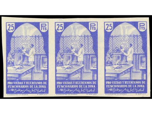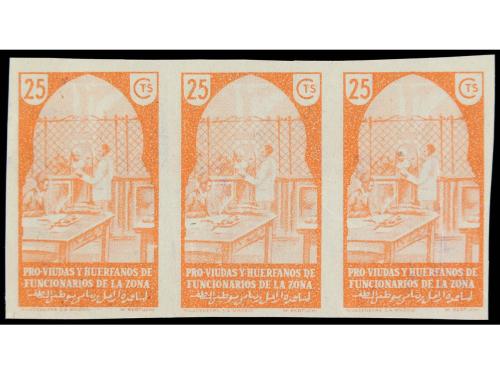 (*) MARRUECOS. BENÉFICOS. Pro Viudas y Huérfanos de Funcionarios de la Zona. 25 pts. al dorso impresión del 25 cts. naranja. Tira de tres sin dentar.